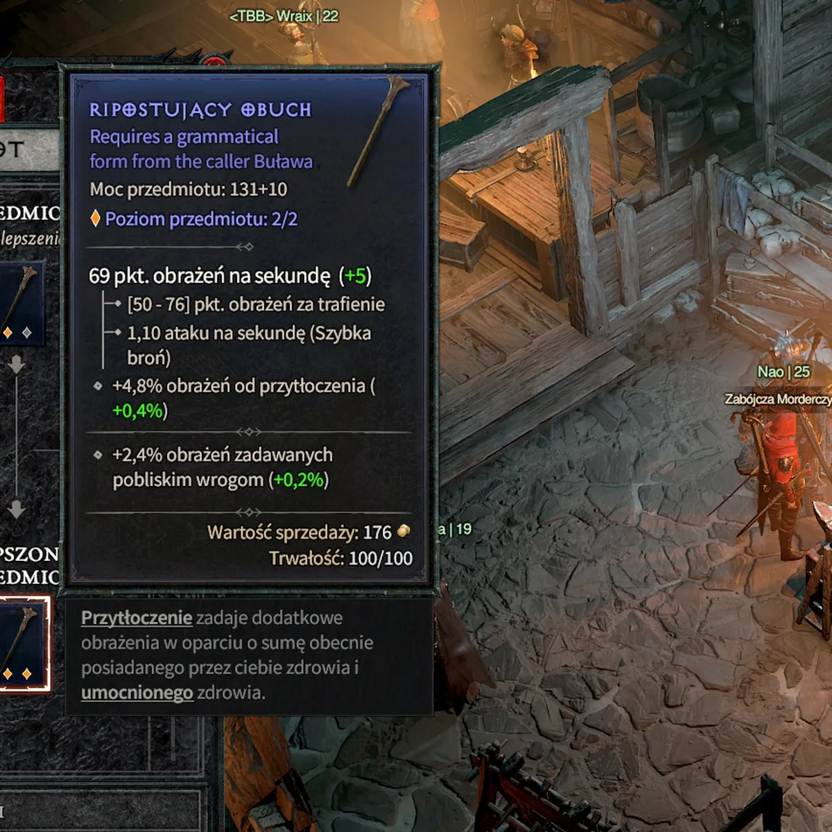 | Młot Wojny | Obrażenia: 60, Siła: 20 | Wzrost obrażeń do 80, dodanie efektu ogłuszenia |